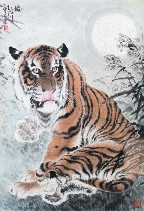 Feng Dazhong is a leading Chinese painter renowned for his mastery of the gongbi technique and lifelong devotion to the tiger as his subject. In Tiger, the animal stands alert beneath a full moon, rendered with fine precision and tonal layering. The work captures both the strength and calm spirit that define Feng’s vision of nature.