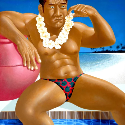 In Empty Barrel (2003), Masriadi presents a hypermasculine figure lounging on a beach in a floral swimsuit and white garland, his confident pose set against a striking tropical backdrop. The bright sea and sky contrast with the oversized pink barrel he leans on, while exaggerated anatomy and saturated colors reveal the artist’s signature visual punch. Beneath the scene’s playful tone lies a layered commentary, with the “empty barrel” suggesting the tension between outward strength and inner hollowness and inviting reflection on performative masculinity, consumer culture, and society’s fixation on image and status.