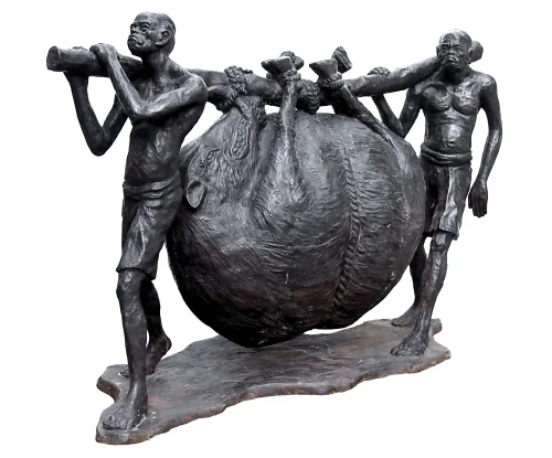 Alongside his paintings, he produced sculptures that carried the same powerful social voice. In this work, two men struggle to carry a massive wild boar bound in a large sack, their strained bodies modeled with rough, expressive surfaces. Continuing Pekik’s “Berburu Celeng” idiom, the wild boar becomes a symbol of oppressive authority and corrupt power during the political unrest of the late 1990s, reflecting the artist’s enduring commitment to the stories and hardships of ordinary people.