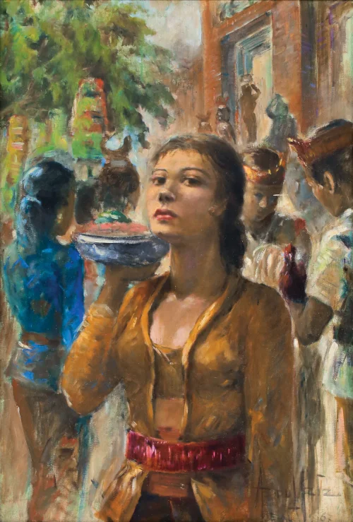 His work titled Kebyar Dancer (1990) is featured in this auction. It presents the intensity of the Balinese Kebyar performance, portraying a dancer in a vibrant orange costume enriched with green, turquoise, and yellow. Set against a pure white background, the composition heightens the dancer’s dynamic movement and creates a powerful visual impression that reflects Srihadi’s ongoing pursuit of spiritual clarity and disciplined expression.